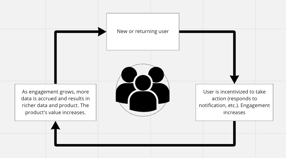You have a network of 100 users but invest in an initiative that automatically solicits information from these members. With the right incentives, users respond and contribute to new and richer data points, which you reinvest back into the product - say, a recommender system. The product accrues value, more people join, and the cycle continues as you organically expand the user base two fold each week.